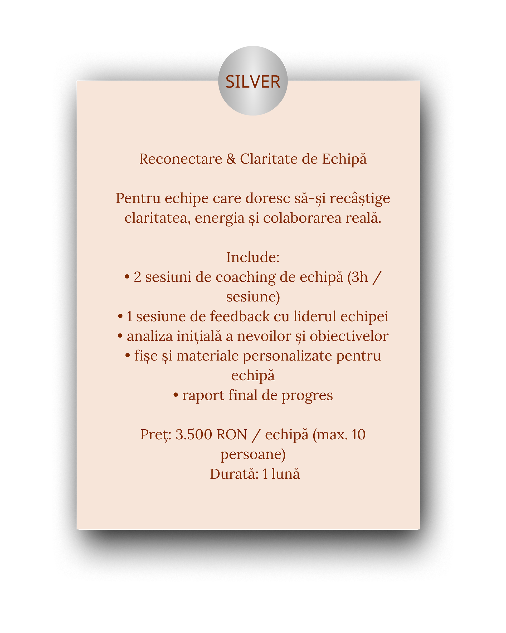 Tarifele includ analiza echipei, pregătirea personalizată și facilitarea profesională.