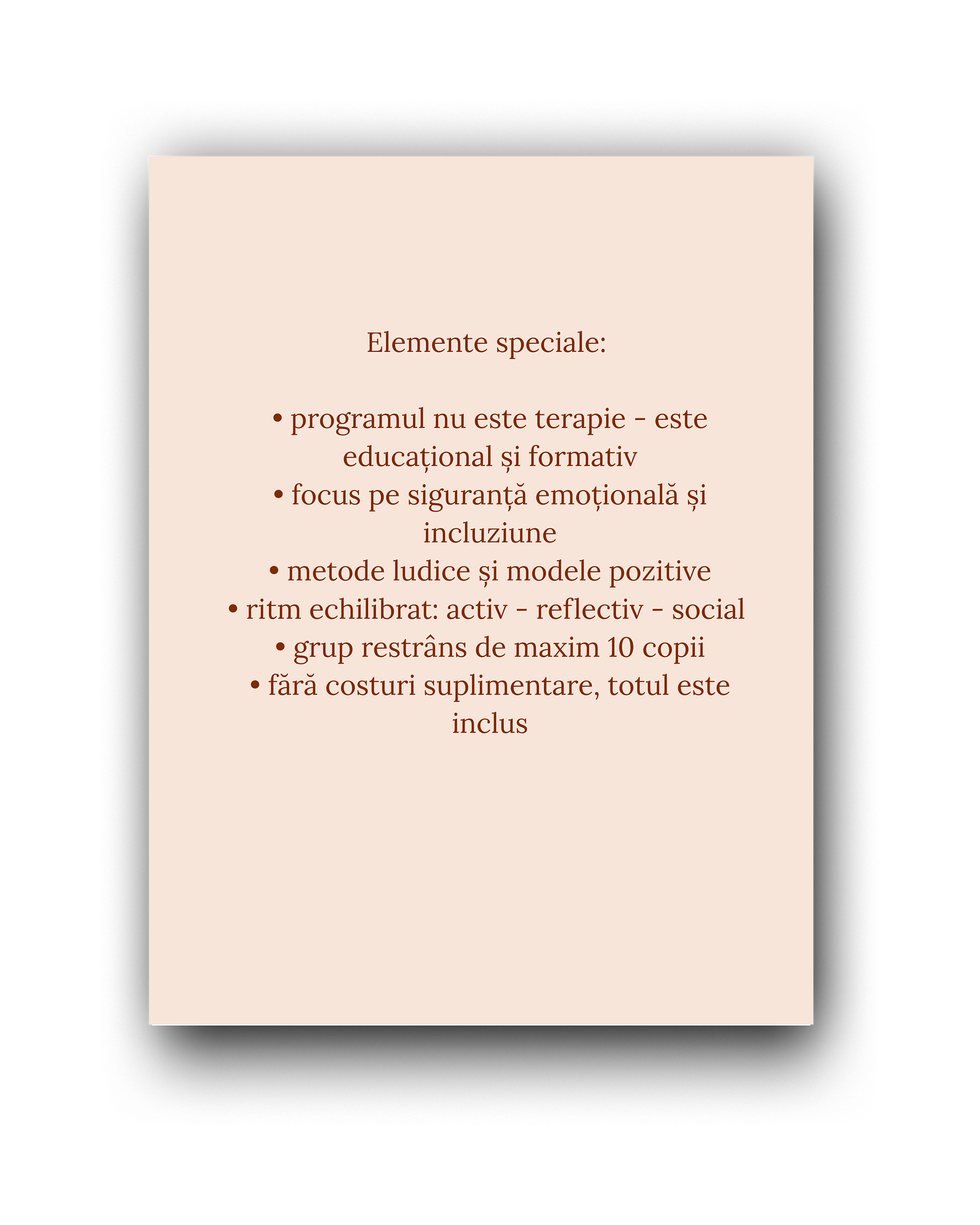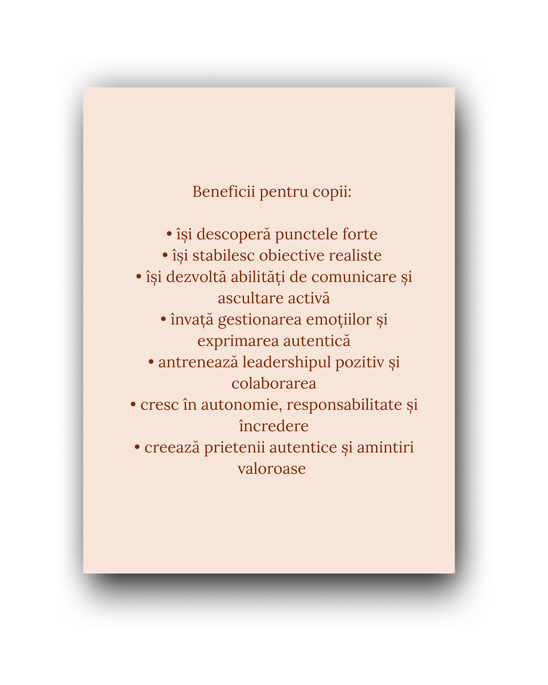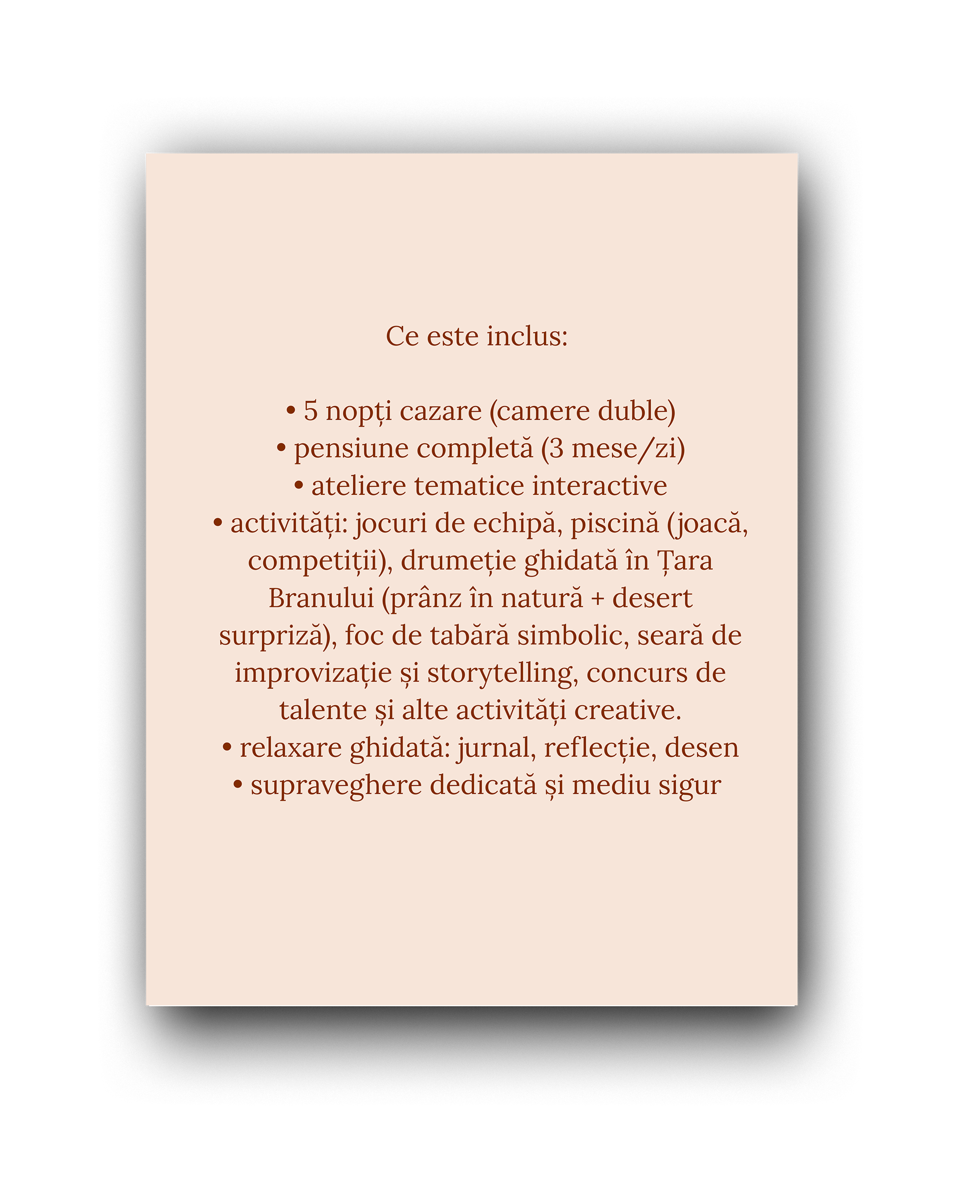 Tabăra Crescendo este o experiență intensivă și distractivă pentru copii 6–12 ani: autocunoaștere, puncte forte, obiective, comunicare, leadership, gestionarea emoțiilor, drumeție ghidată în Țara Branului, activități sportive, piscină și seară de improvizație.