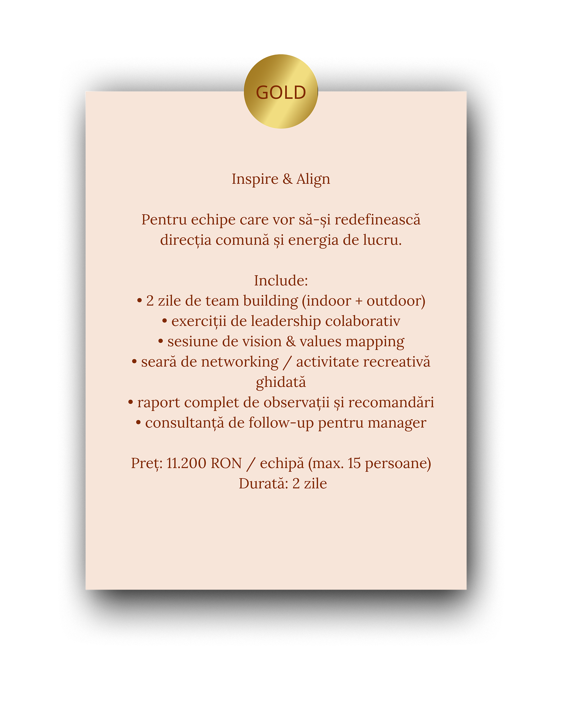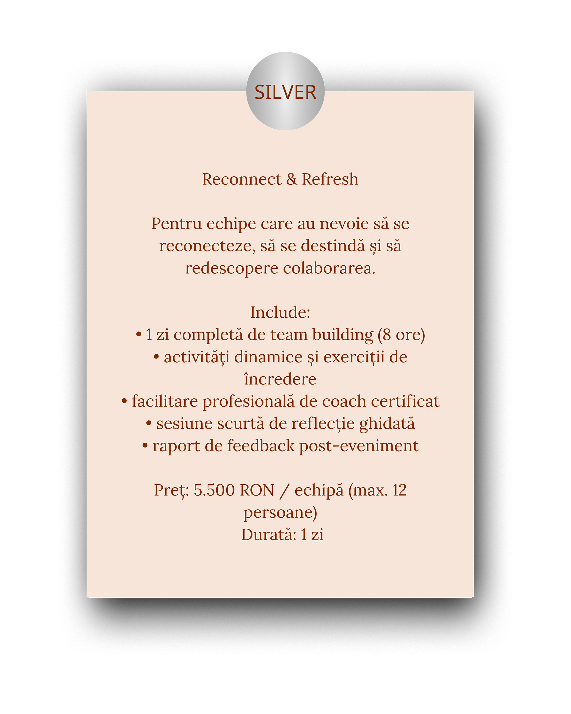 Toate pachetele includ facilitare profesională, materiale de lucru și follow-up personalizat.